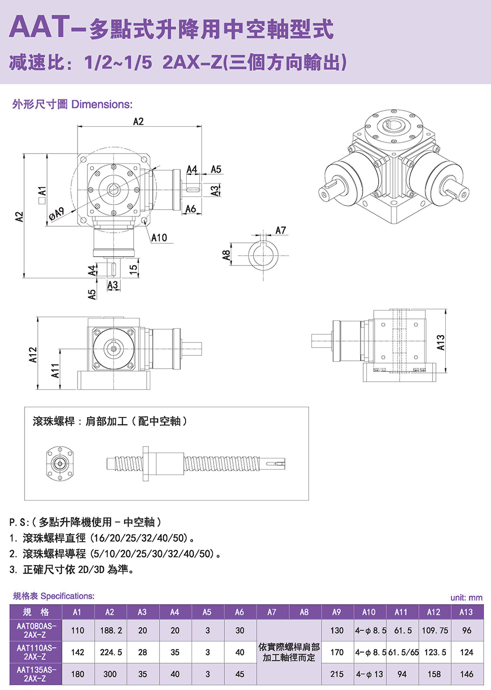 多樣化:輸出軸種類多樣化,有單出力軸型、雙出力軸型、中空軸型、中空法蘭型、中空軸錐形緊迫性、螺桿直線型、螺牙直線型。