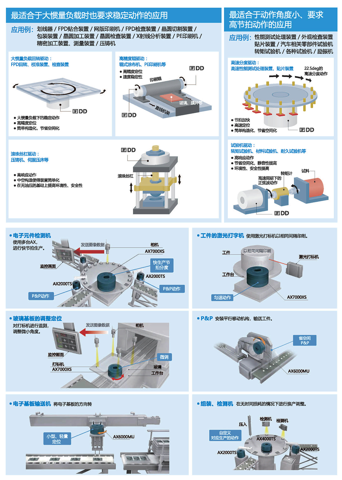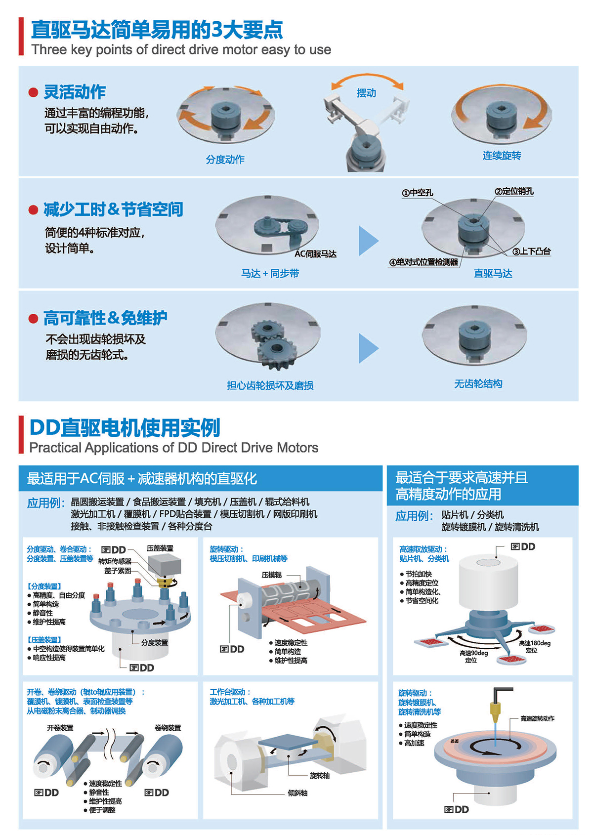 直徑從60mm-490mm、連續(xù)扭矩從1-1200N.m有十幾個大小可選規(guī)格,絕對精度可達(dá)±10arc-sec,重復(fù)定位精度可達(dá)±0.5arc-sec。具有高精度、高剛性、低軸向徑向跳動等優(yōu)點,被廣泛應(yīng)用于半導(dǎo)體生產(chǎn)設(shè)備、光媒體、光學(xué)對位、定位檢測、精密數(shù)控機(jī)床、汽車裝配/檢測、液晶制造設(shè)備、屏幕貼合設(shè)備、鋰電池制造設(shè)備、高端絲印設(shè)備及醫(yī)療器械等微精密高端制造業(yè)領(lǐng)域。
