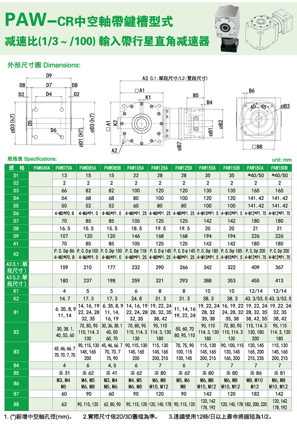 多樣化:輸出軸種類多樣化,有單出力軸型、雙出力軸型、中空軸型、中空法蘭型、中空軸錐形緊迫性、螺桿直線型、螺牙直線型。