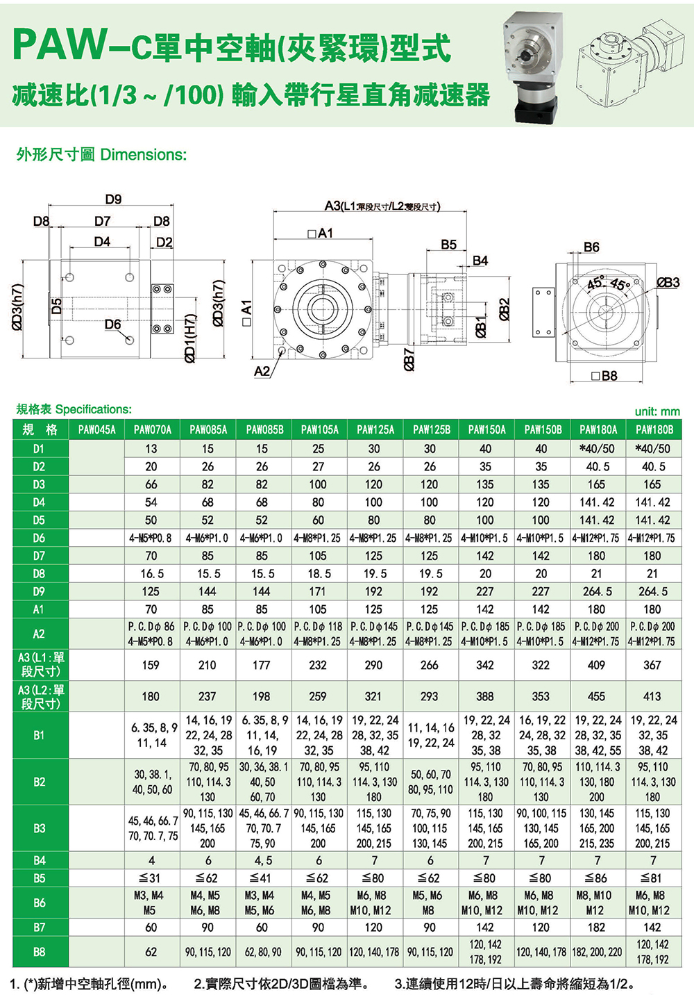 多樣化:輸出軸種類多樣化,有單出力軸型、雙出力軸型、中空軸型、中空法蘭型、中空軸錐形緊迫性、螺桿直線型、螺牙直線型。