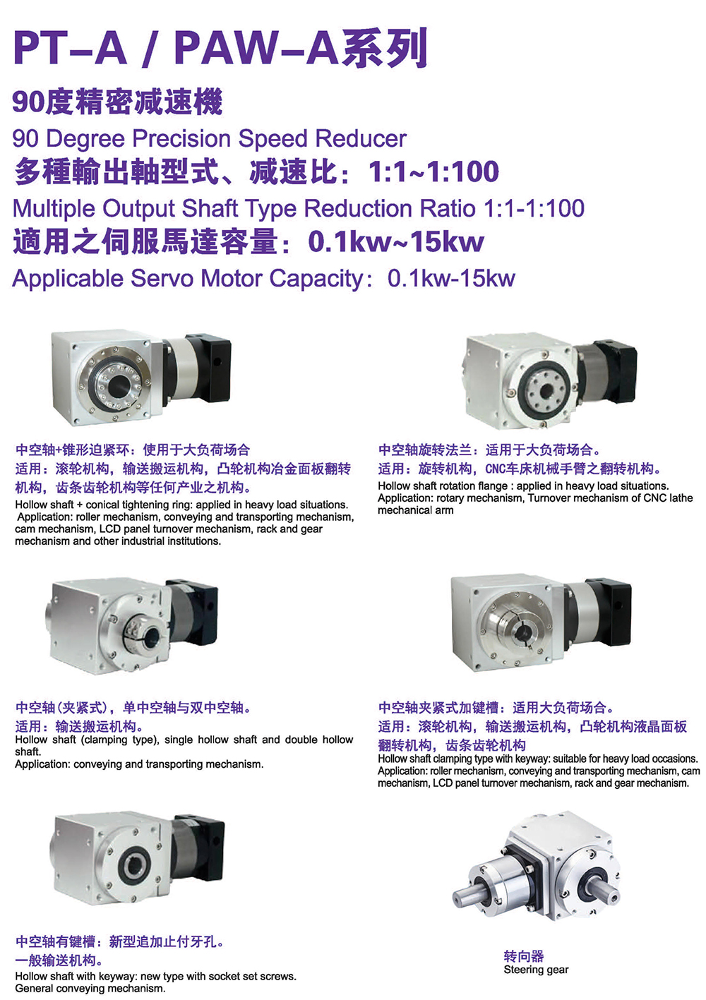 多樣化:輸出軸種類(lèi)多樣化,有單出力軸型、雙出力軸型、中空軸型、中空法蘭型、中空軸錐形緊迫性、螺桿直線型、螺牙直線型。