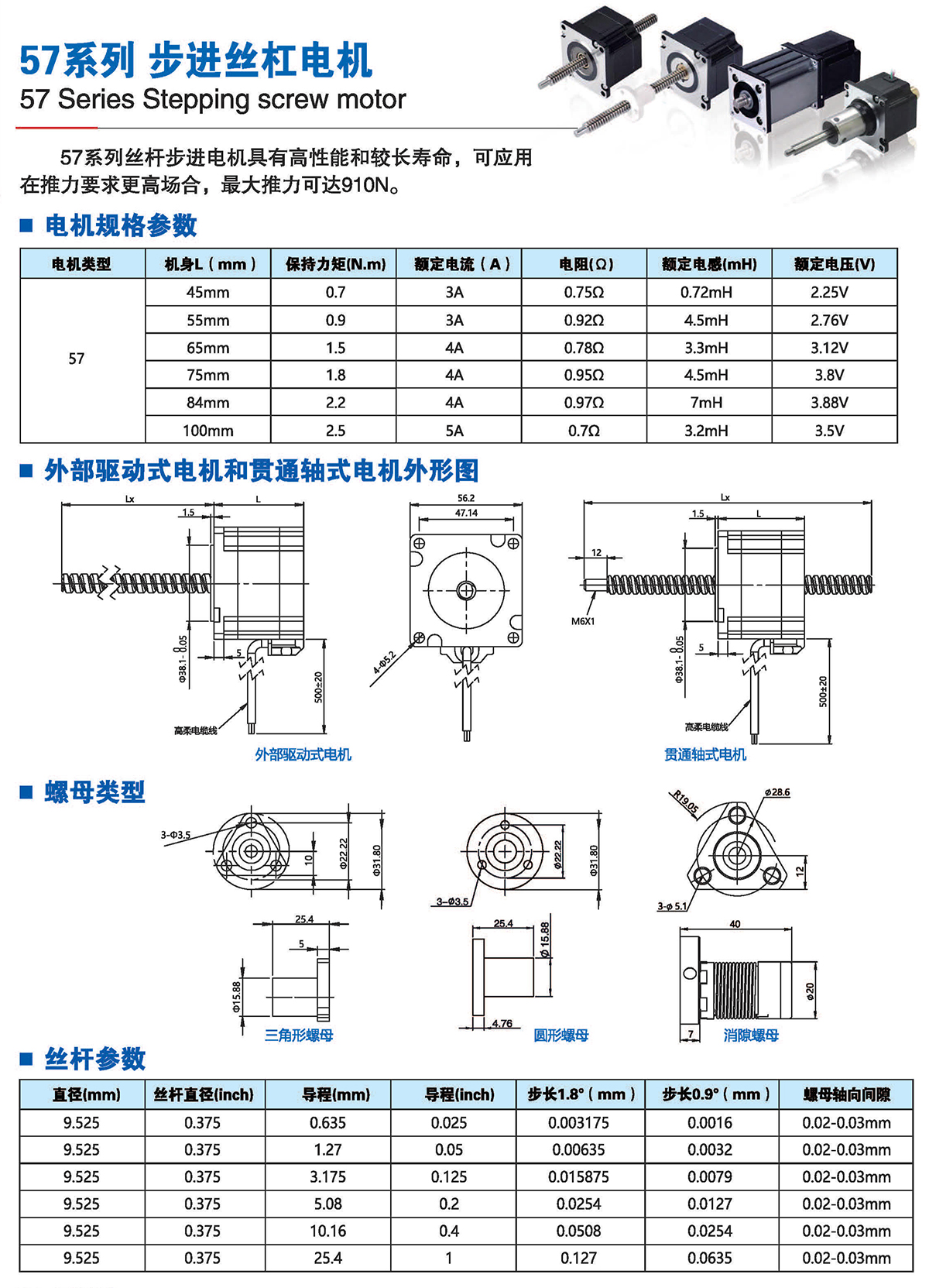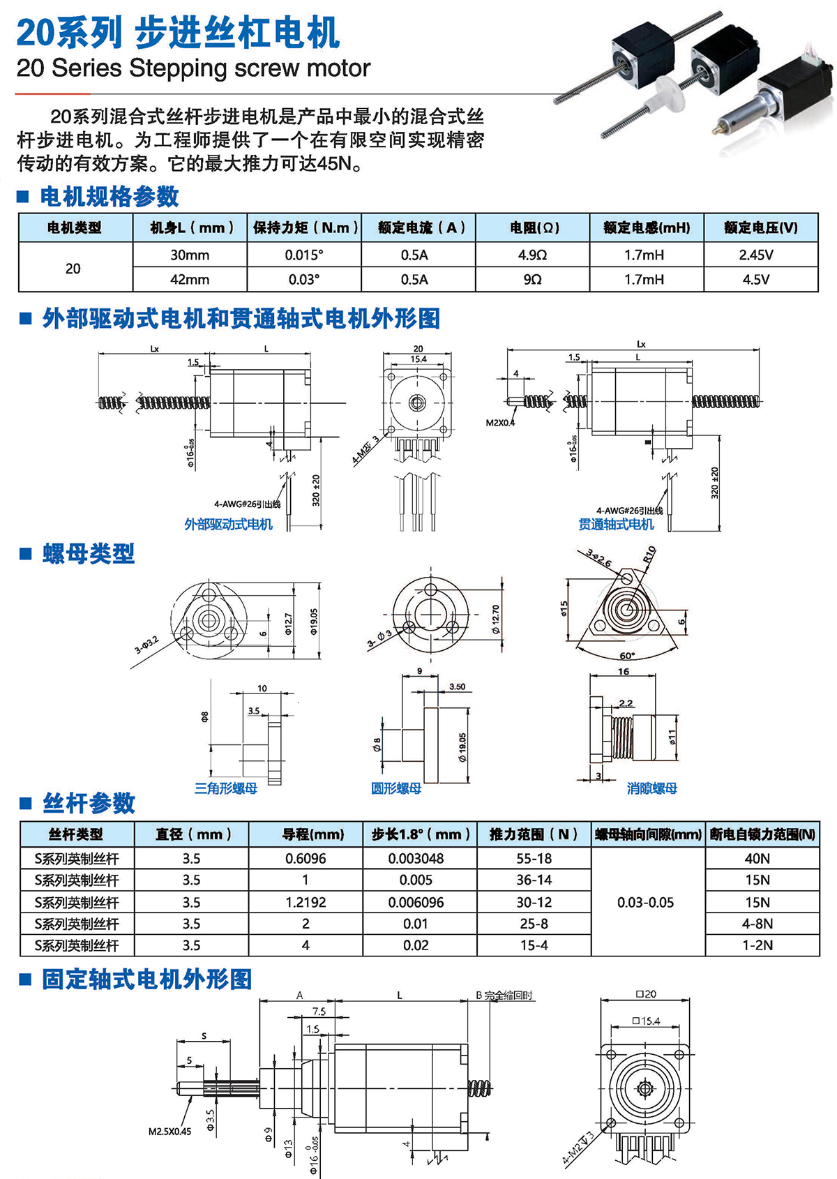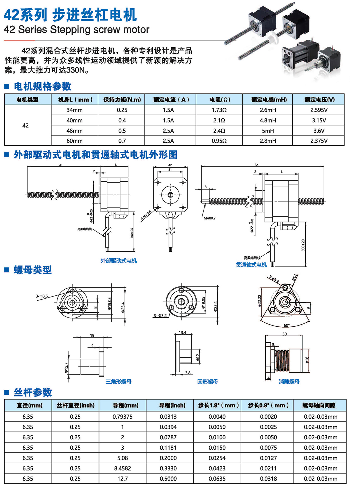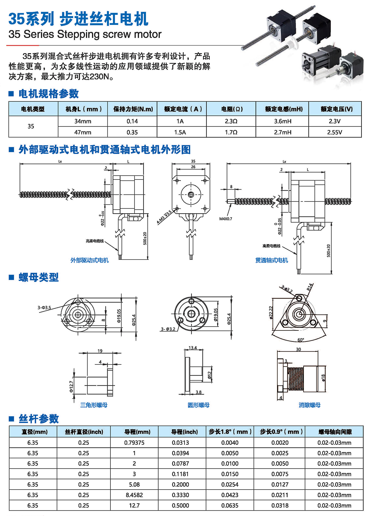 絲桿步進電機系列產(chǎn)品提供了簡單有效的直線運動方案,簡化了從旋轉(zhuǎn)運動到 直線運動的轉(zhuǎn)化過程,它將運動的轉(zhuǎn)換過程在電機本體完成,不再需要皮帶、齒輪 齒條、聯(lián)軸器和其他機械部件來實現(xiàn)旋轉(zhuǎn)運動到直線運動的轉(zhuǎn)換,大大節(jié)省了零部 件的采購成本和系統(tǒng)組裝時間,有效解決了因多次轉(zhuǎn)接造成的精度損失,提高 了結(jié) 構(gòu)空間的利用率和定位精度。我司的產(chǎn)品結(jié)構(gòu)簡單、緊湊,適用于500mm行程內(nèi)運 行,步進分辨率小為0.0015mm,推力可達200多公斤力。