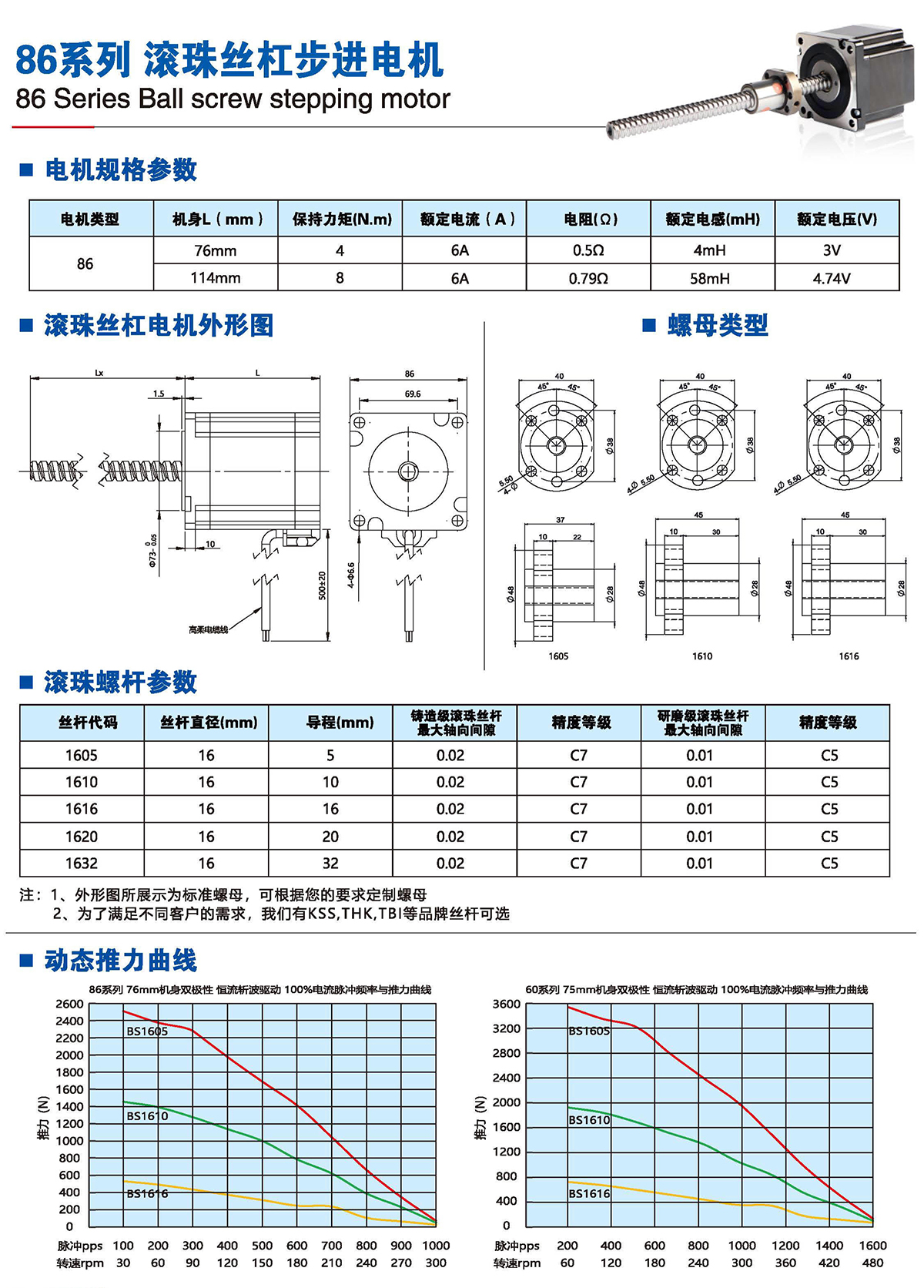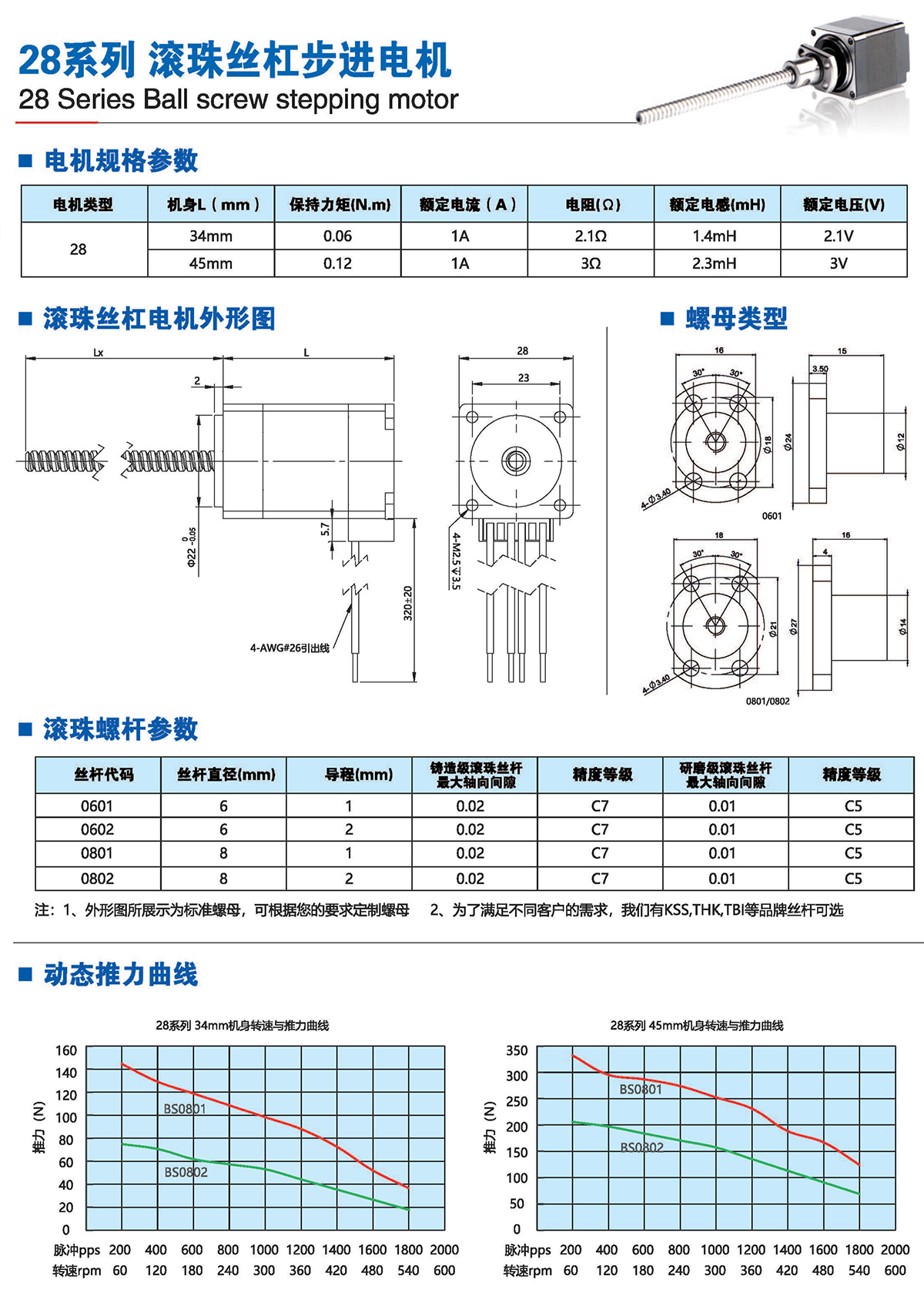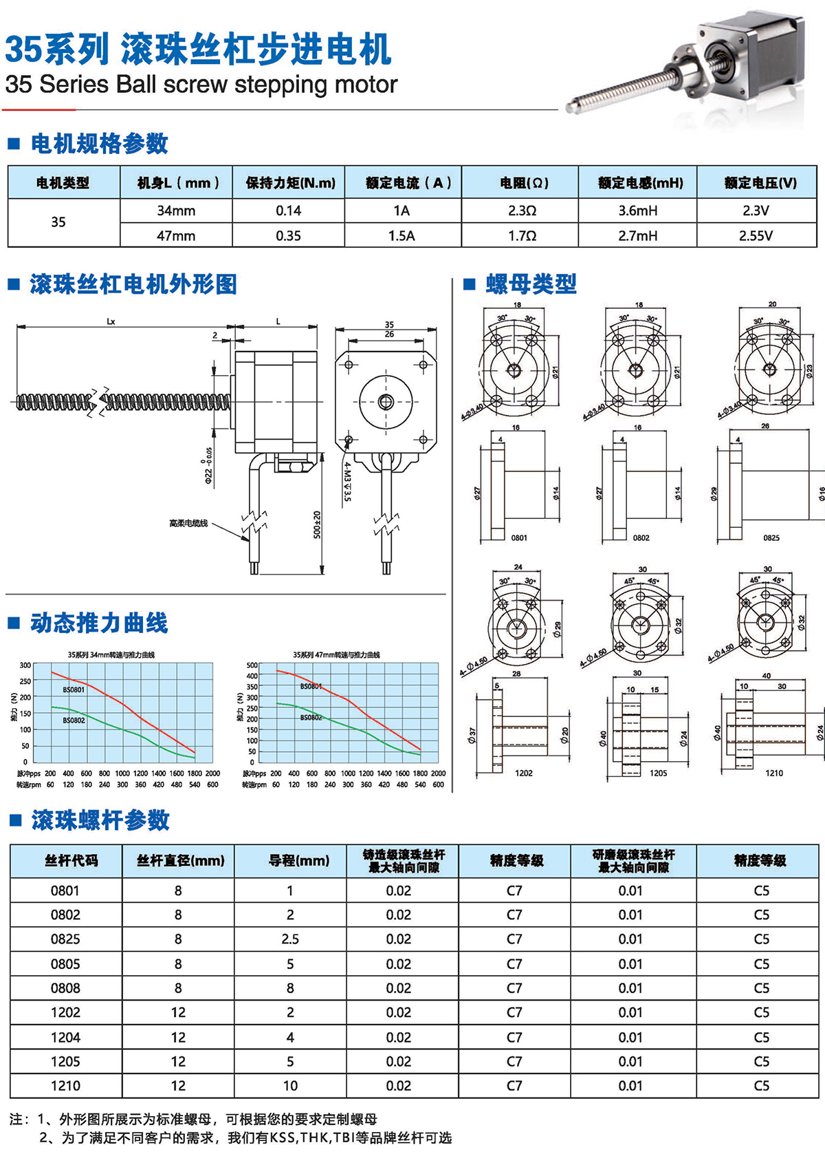 滾珠絲桿步進電機有六種尺寸,外形尺寸從14mm至86mm,滾珠絲桿電機為外部驅(qū)動式。 從0.005mm/步到0. 1mm/步,有多種步長可選。推力可達1600N,全系可 選配編碼器。