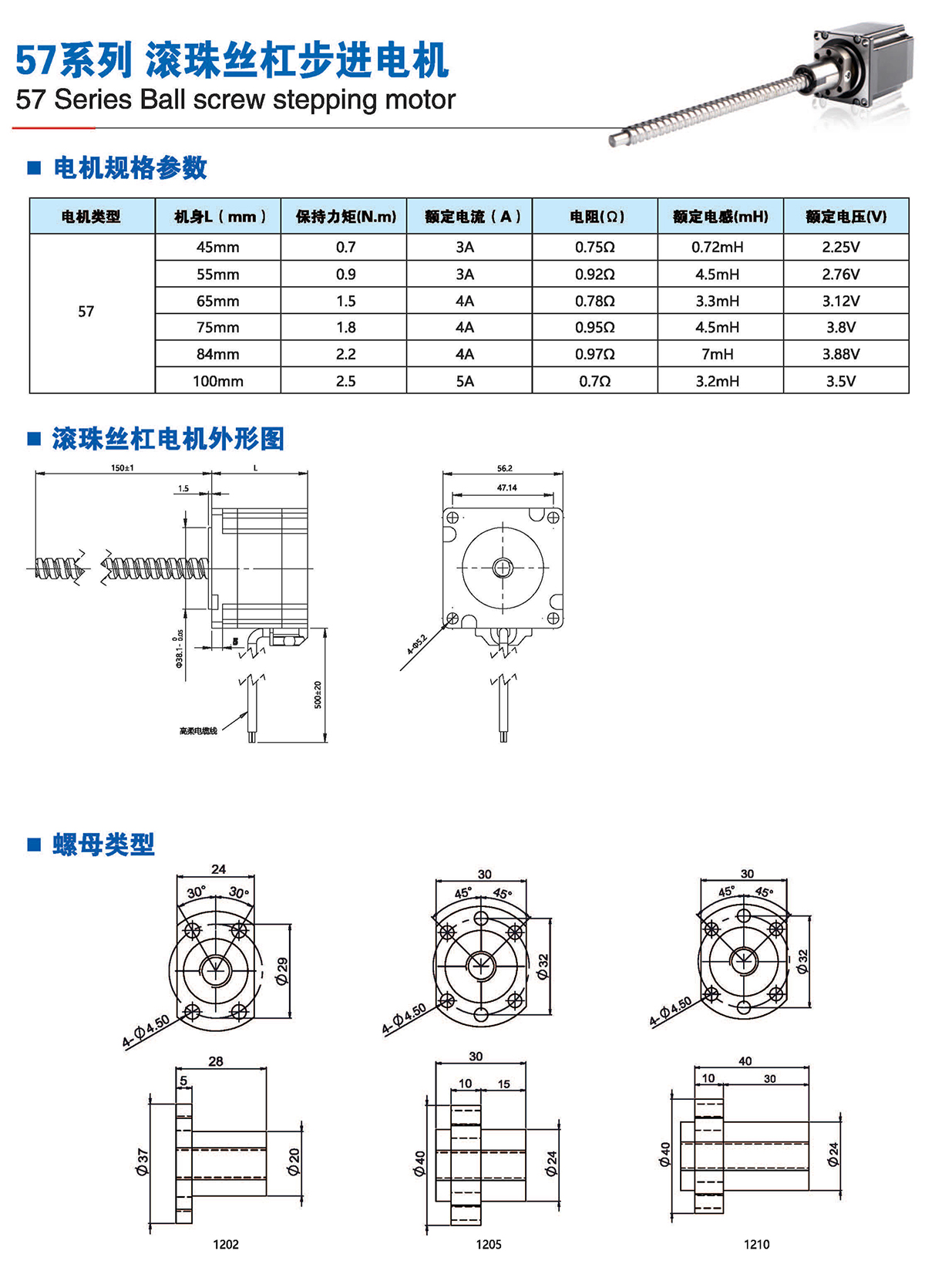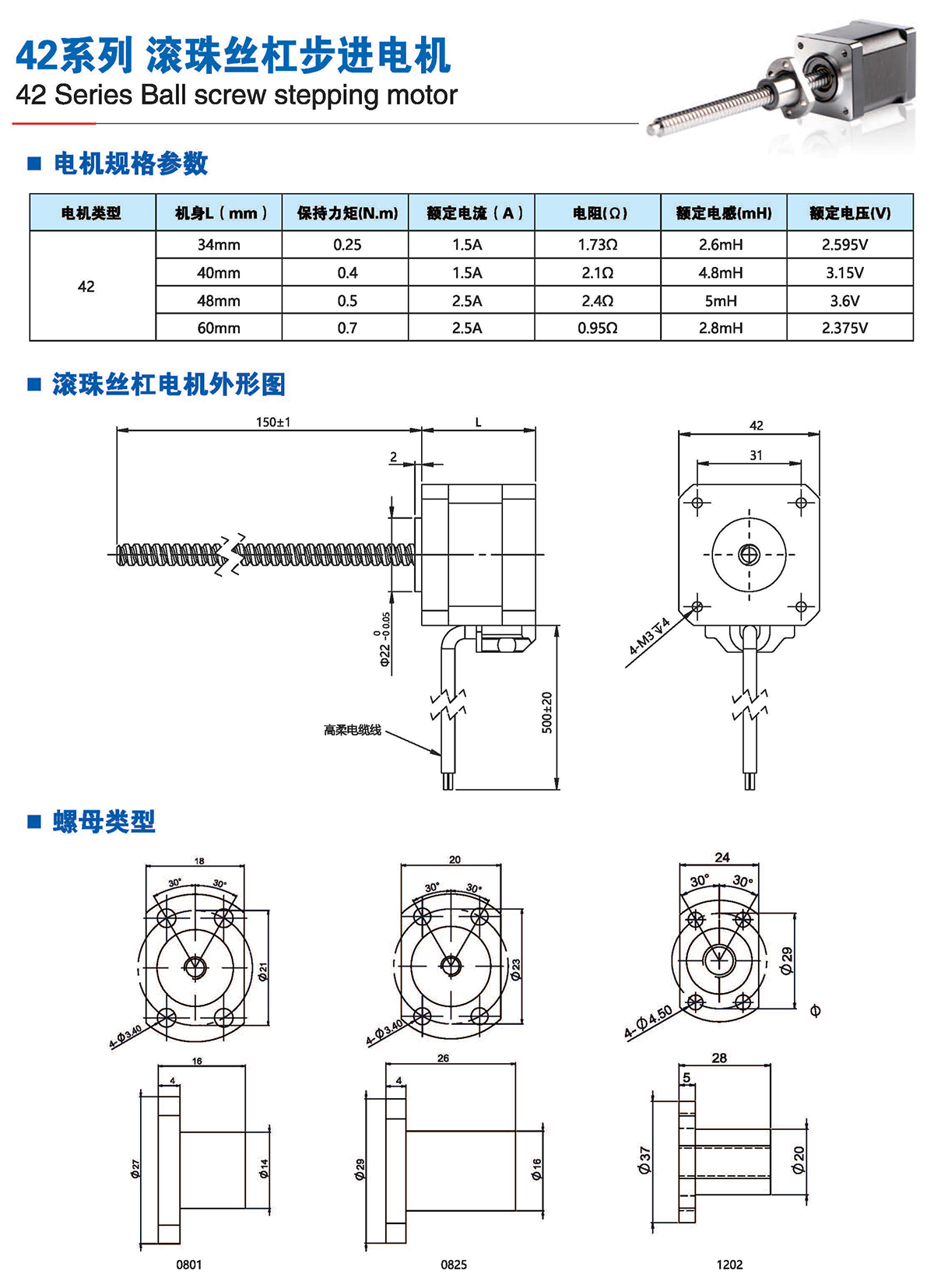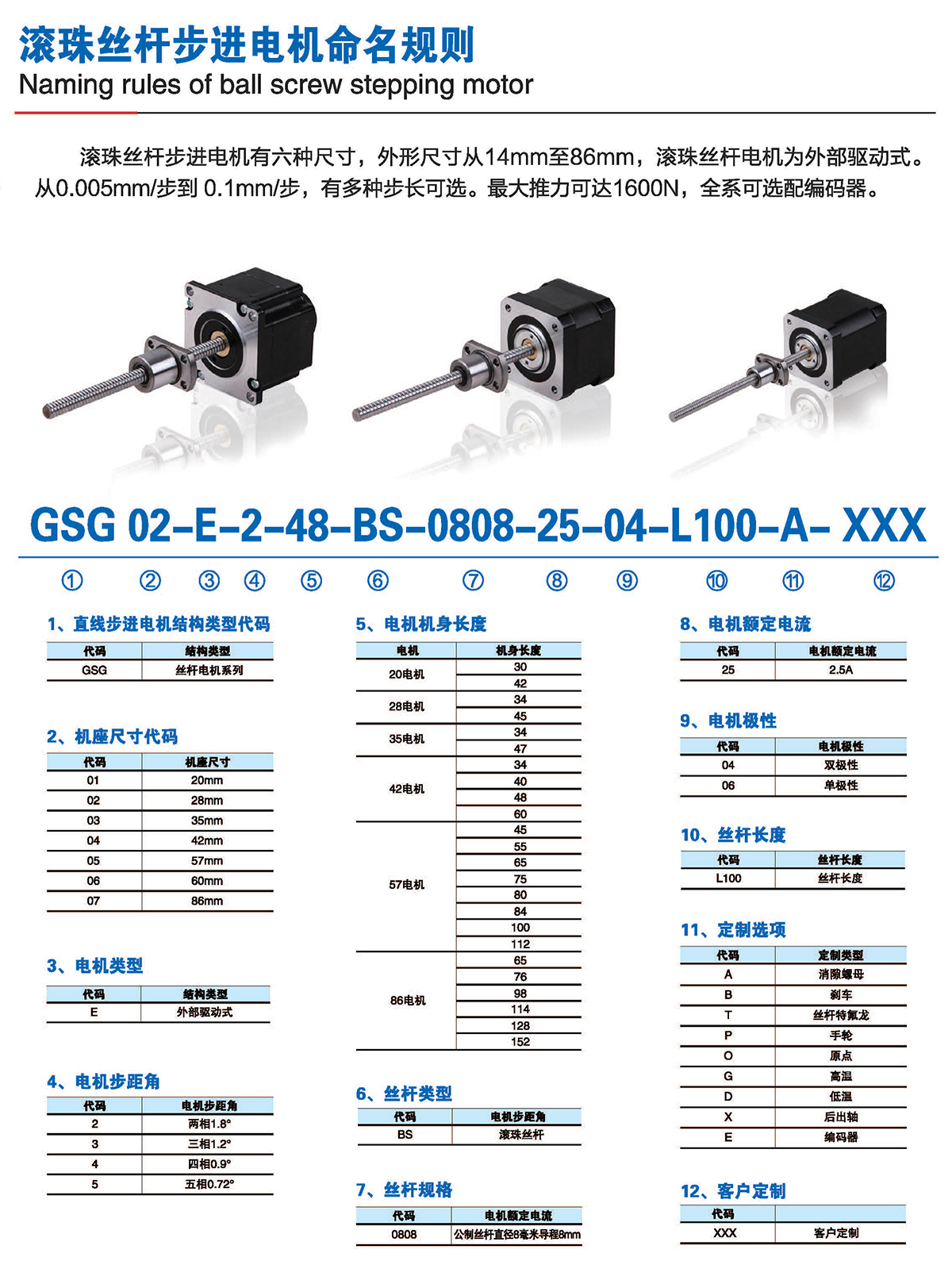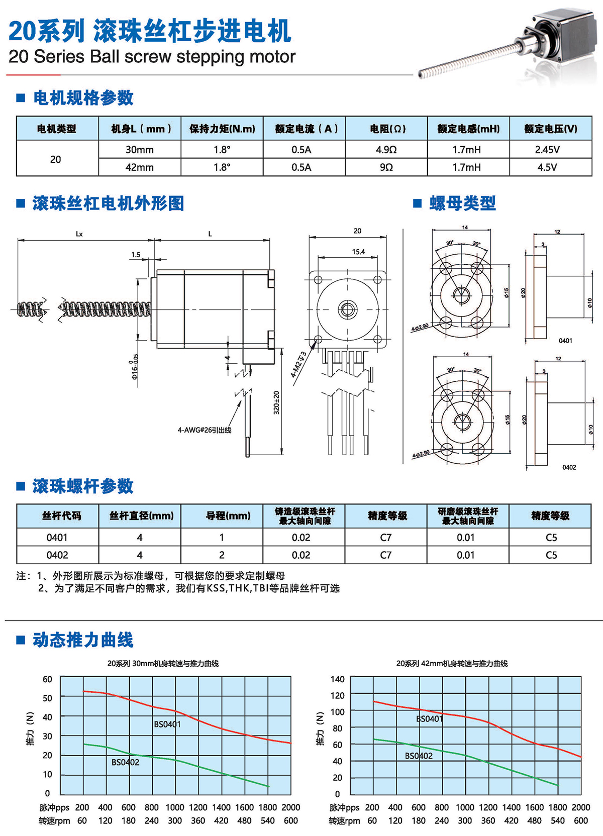 滾珠絲桿步進電機有六種尺寸,外形尺寸從14mm至86mm,滾珠絲桿電機為外部驅(qū)動式。 從0.005mm/步到0. 1mm/步,有多種步長可選。推力可達1600N,全系可 選配編碼器。