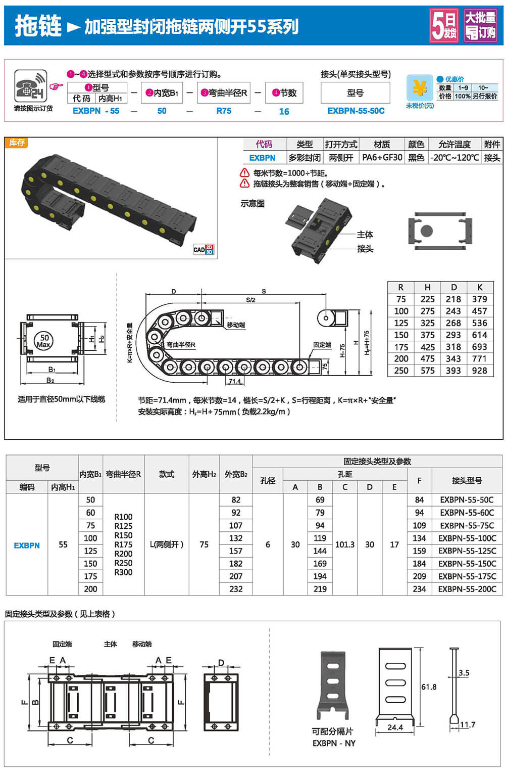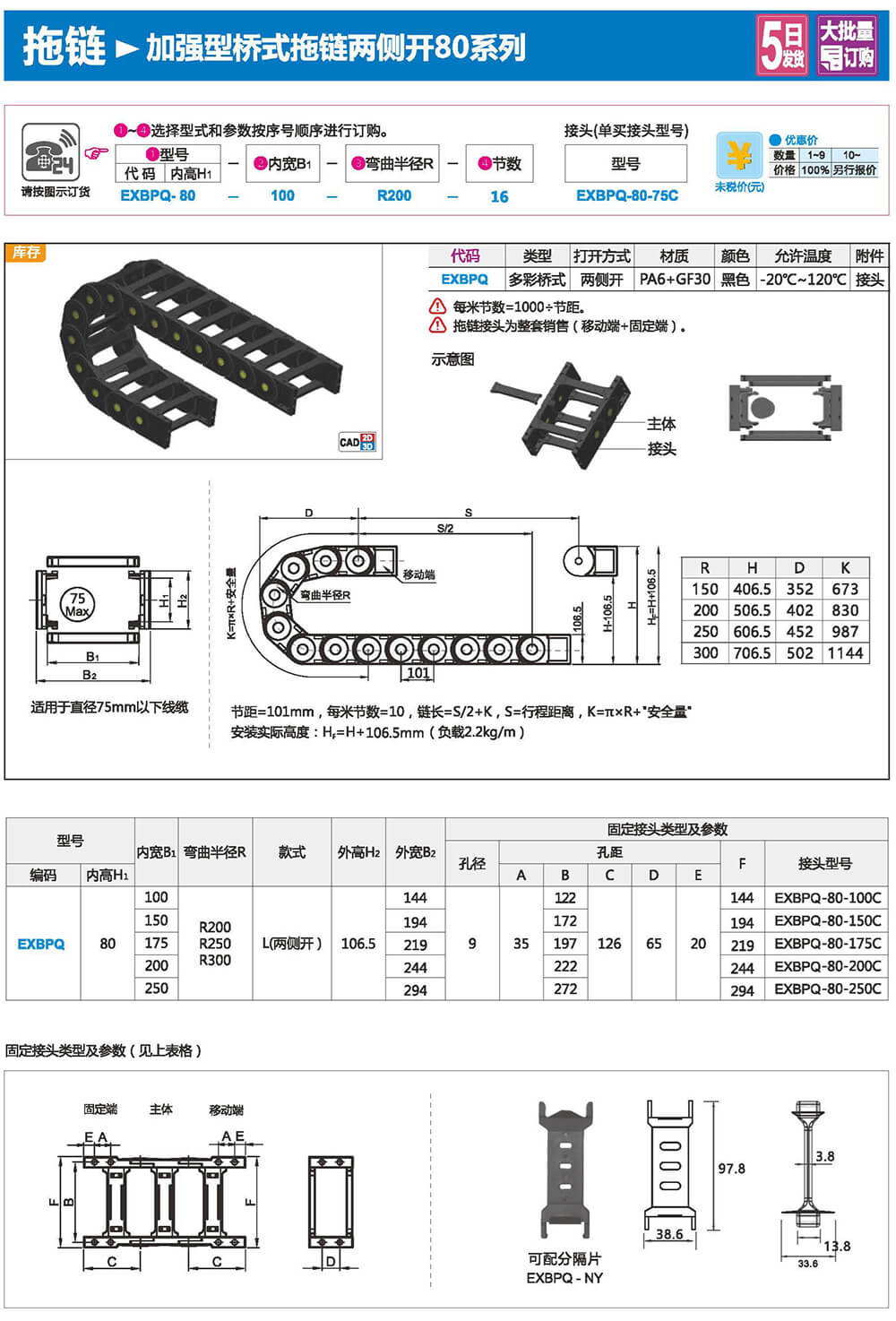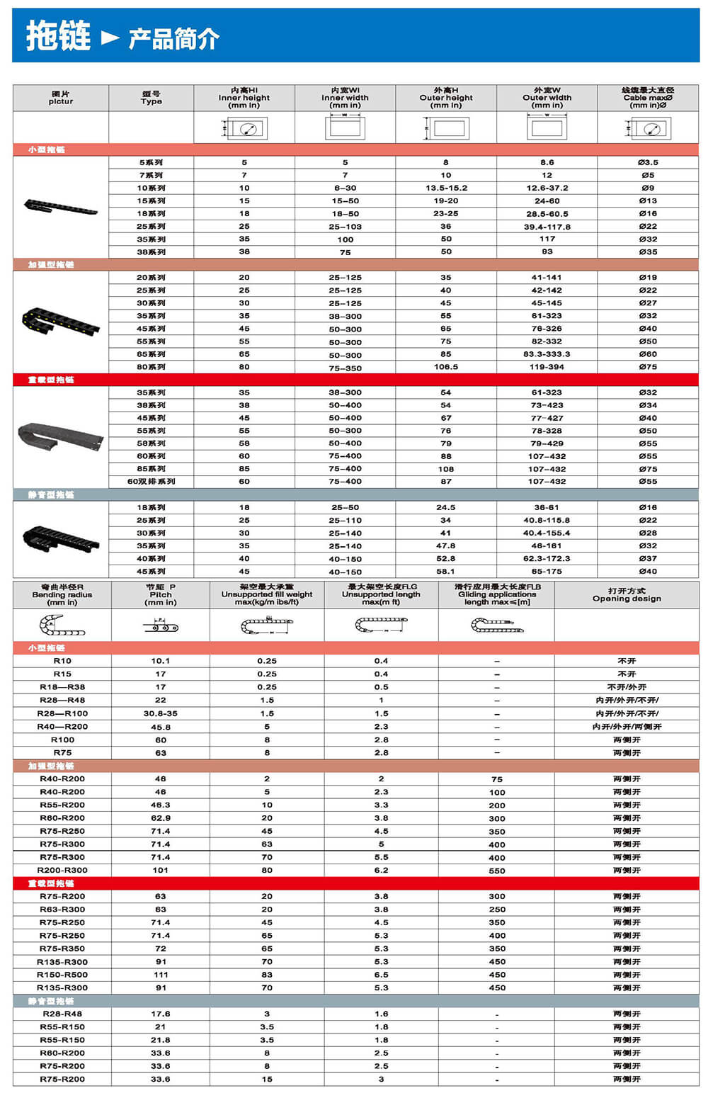 適合于使用在往復運動的場合,能夠?qū)?nèi)置的電纜、油管、氣管、水管等起到牽引和保護作用,拖鏈每節(jié)都能打開,便于安裝和維修。運動時噪音低、耐磨、可高速運動。拖鏈已被廣泛應用于數(shù)控機床.電子設備、石材機械、玻璃機械、門窗機械、注塑機、機械手、起重運輸設備、自動化倉庫等。