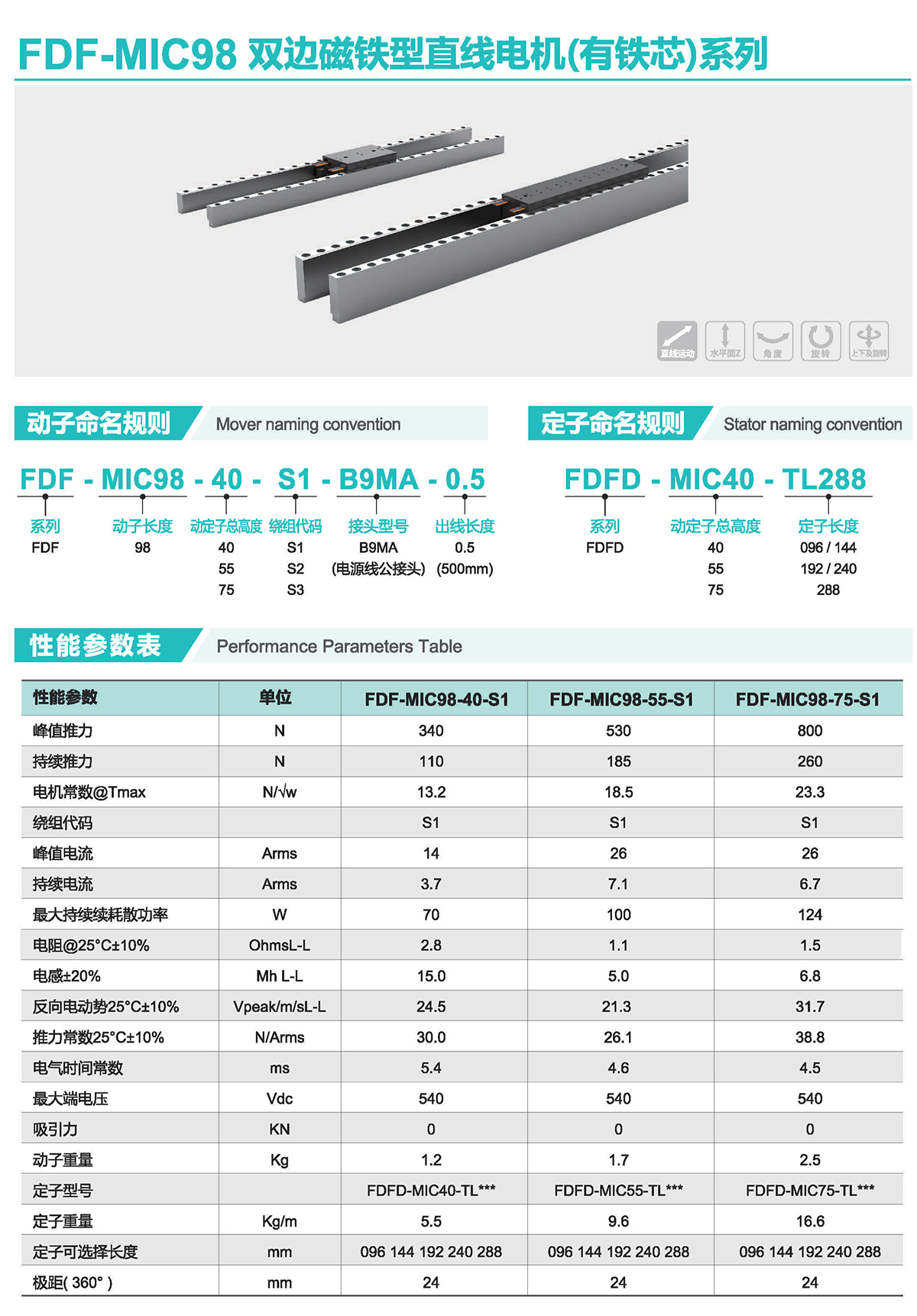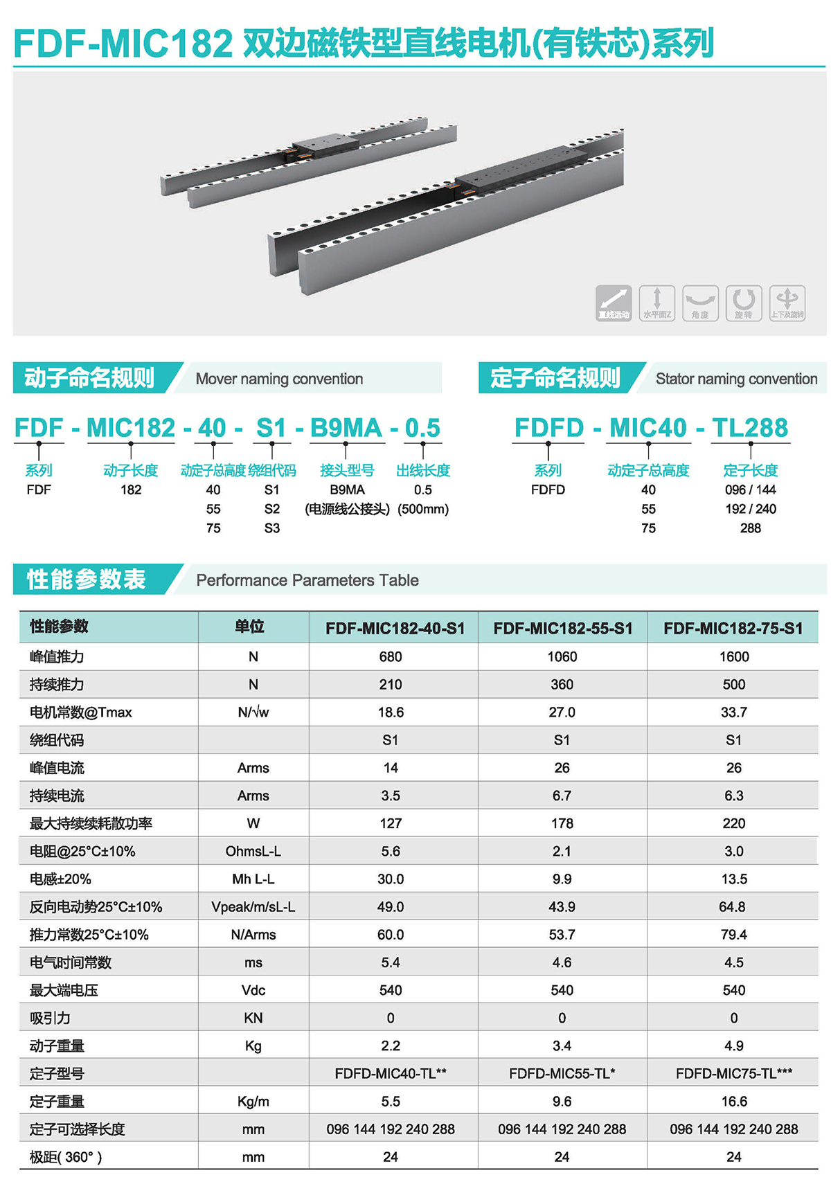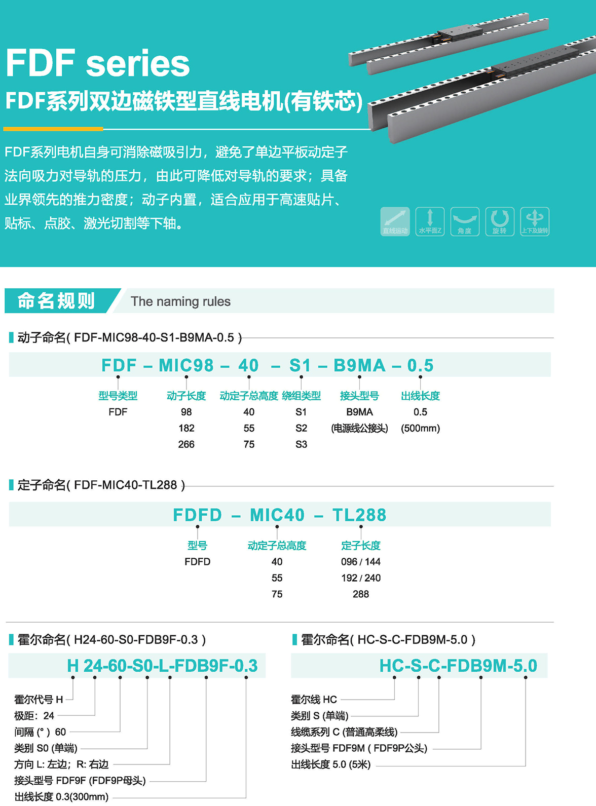 FDF系列電機自身可消除磁吸引力,避免了單邊平板動定子法向吸力對導(dǎo)軌的壓力,由此可降低對導(dǎo)軌的要求;具備業(yè)界領(lǐng)先的推力密度;動內(nèi)置,適合應(yīng)用于高速貼片、貼標(biāo)、點膠、激光切割等下軸。