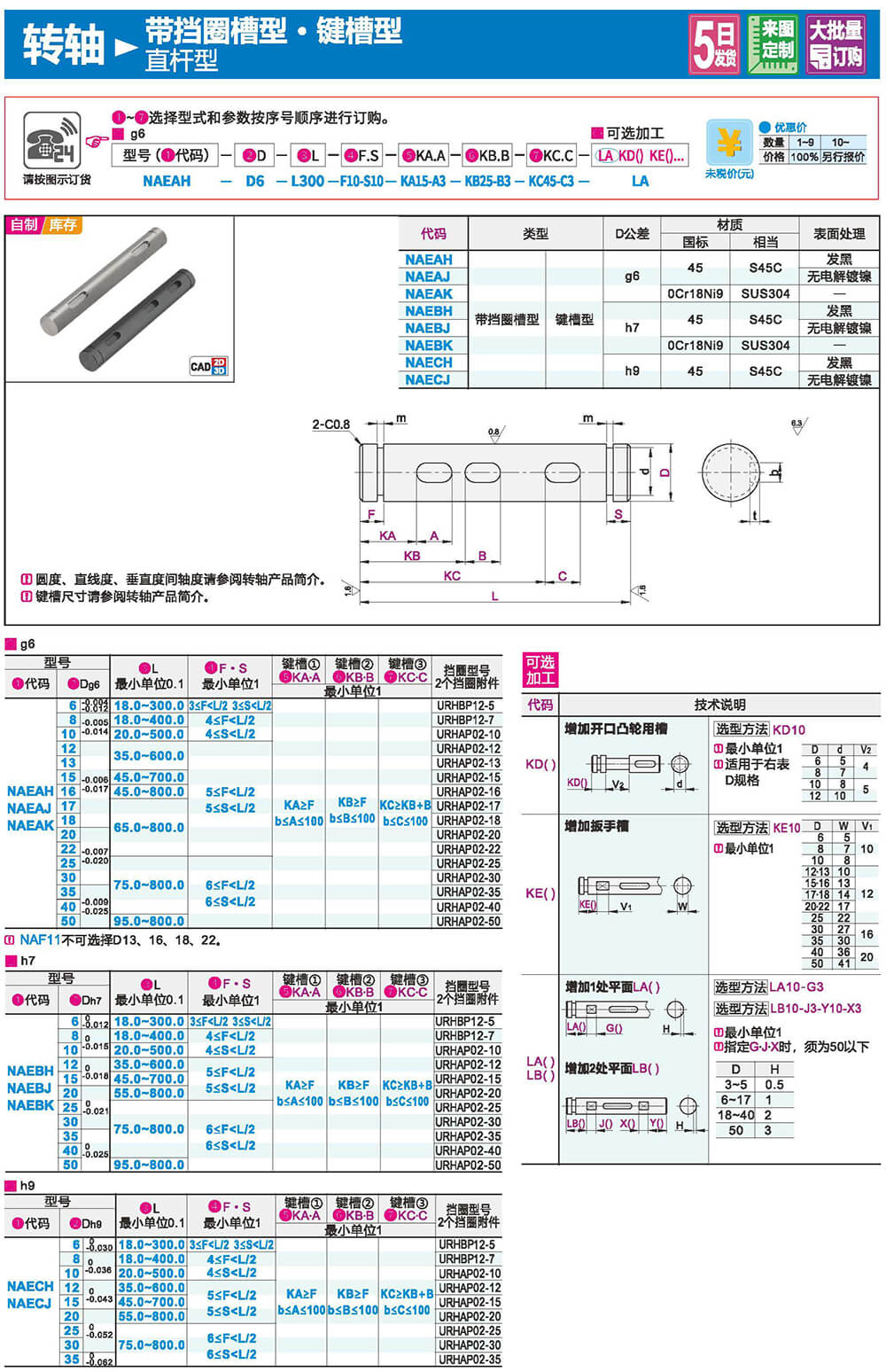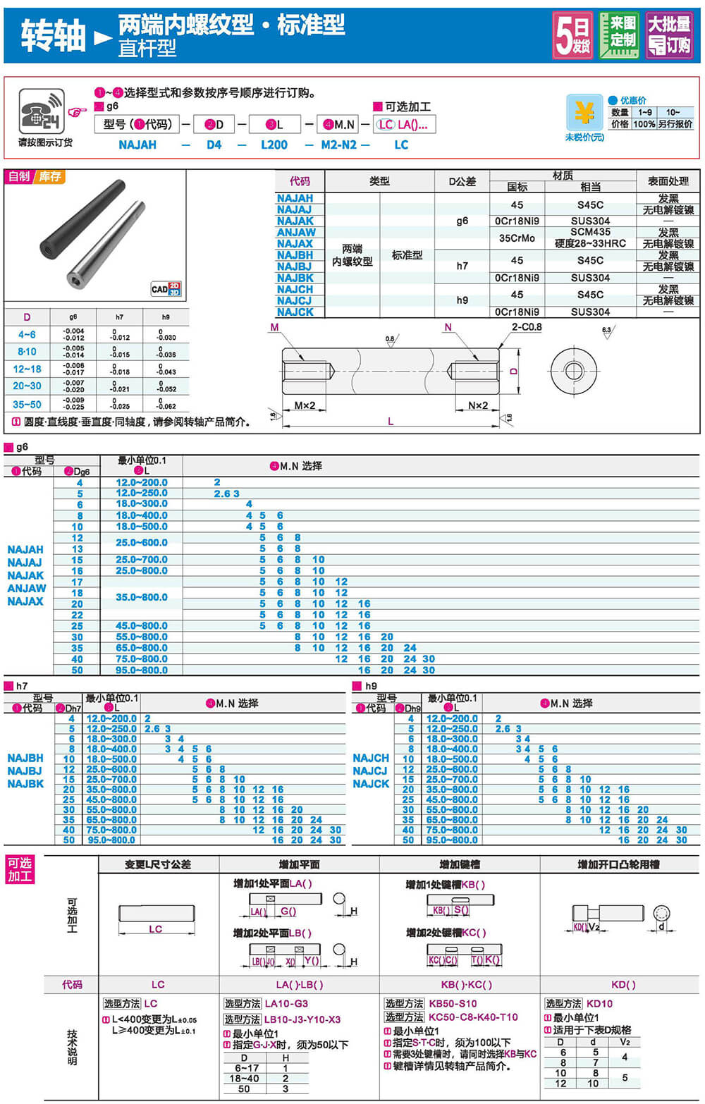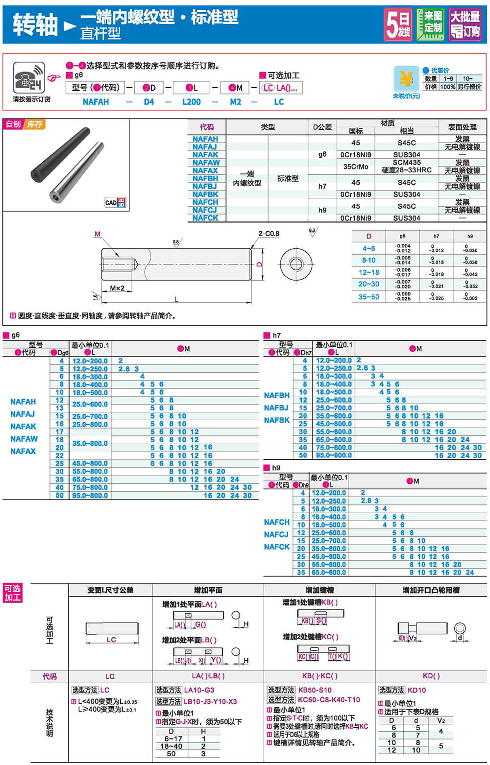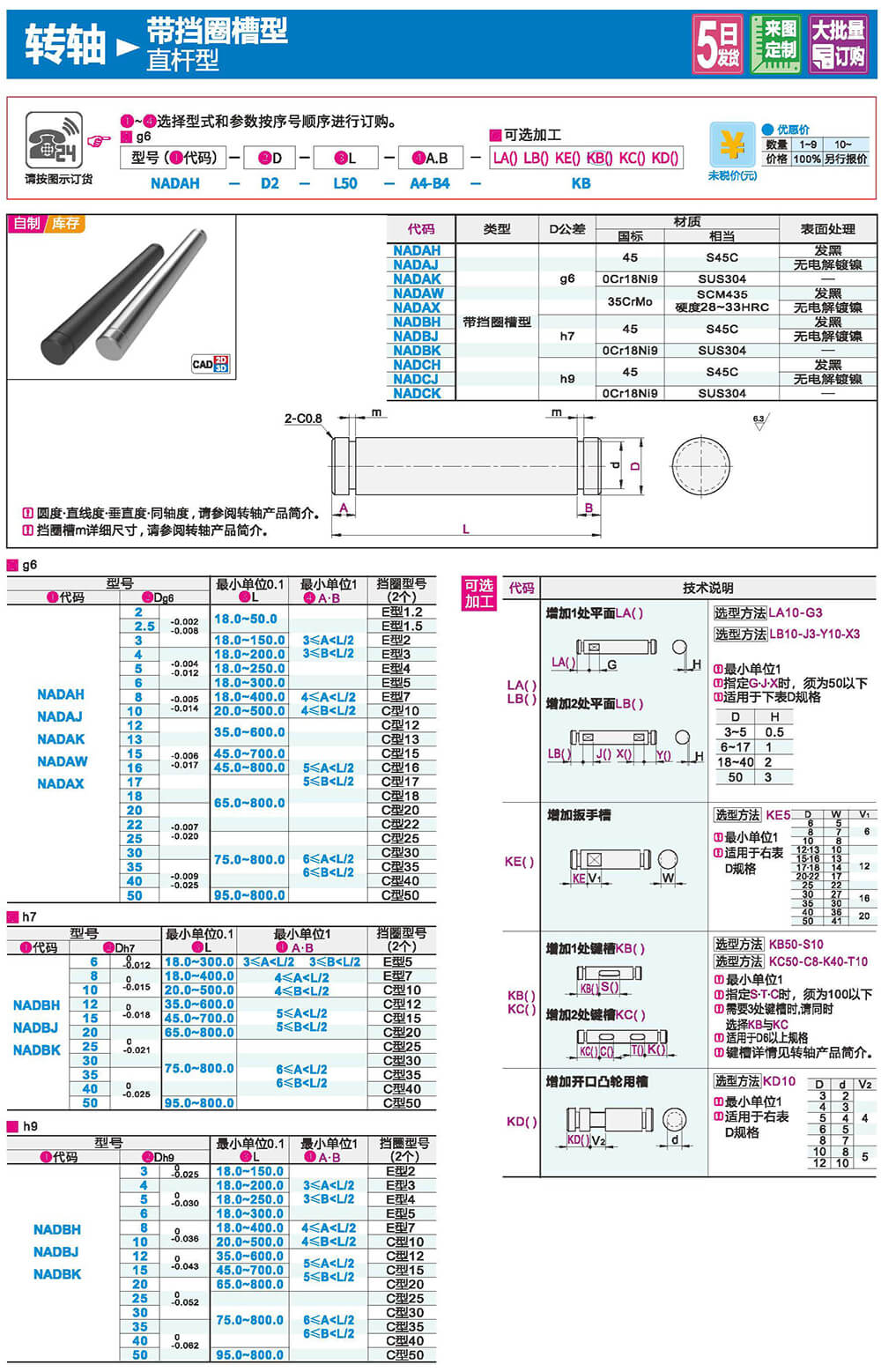 用于傳遞動力、傳送物體等旋轉(zhuǎn)用途的軸??勺鳛檩S承、帶輪、滾輪的軸使用。 備有便于組裝的h9、h7。g6公差??勺芳渔I槽、扣環(huán)槽。平面、扳手槽等加工。