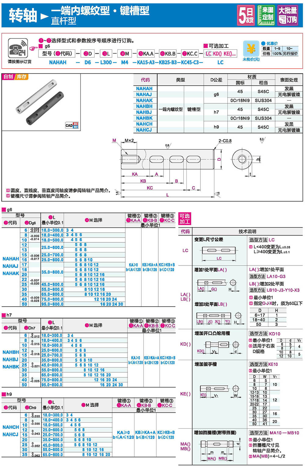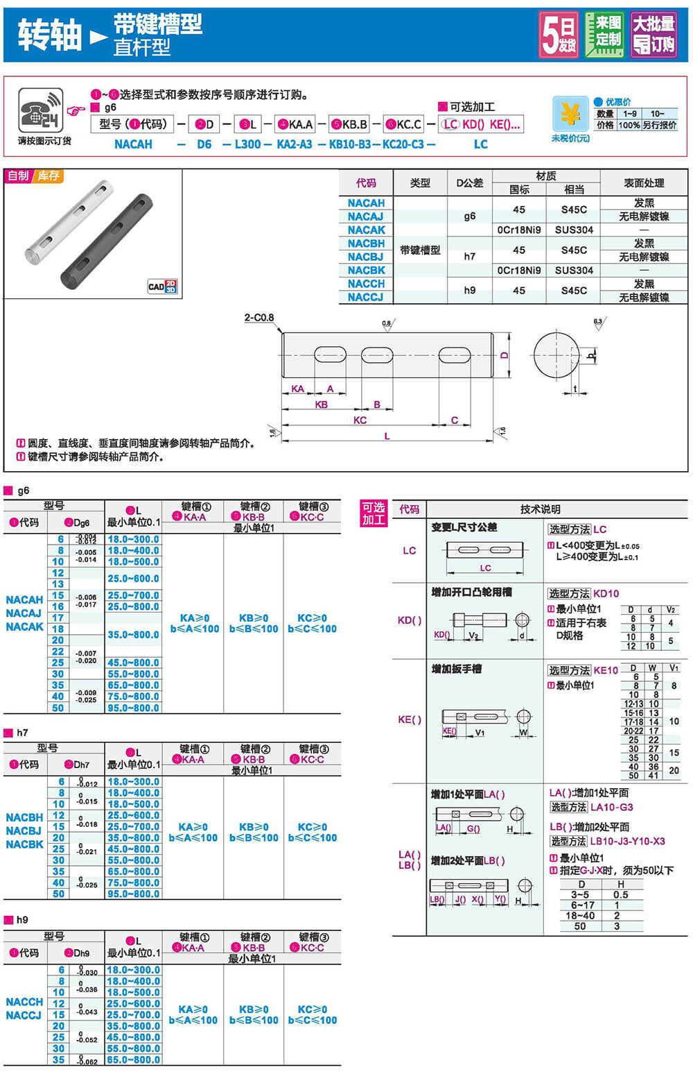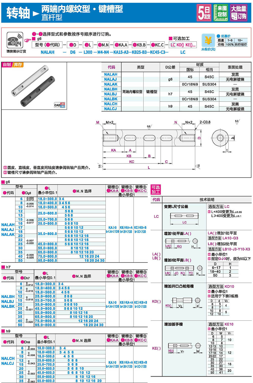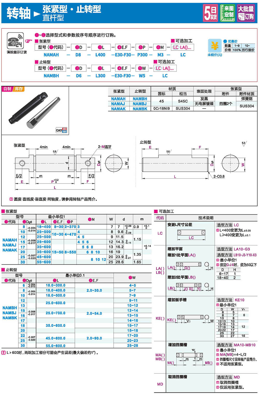用于傳遞動力、傳送物體等旋轉(zhuǎn)用途的軸??勺鳛檩S承、帶輪、滾輪的軸使用。 備有便于組裝的h9、h7。g6公差??勺芳渔I槽、扣環(huán)槽。平面、扳手槽等加工。