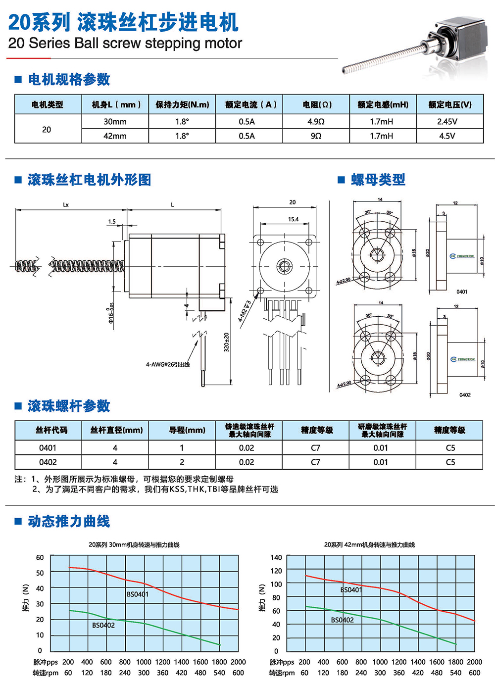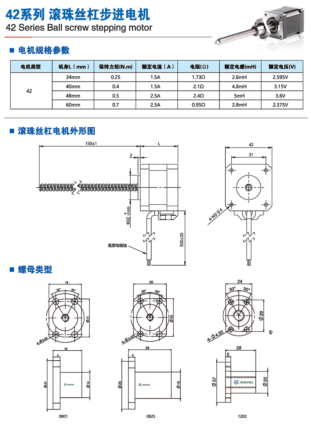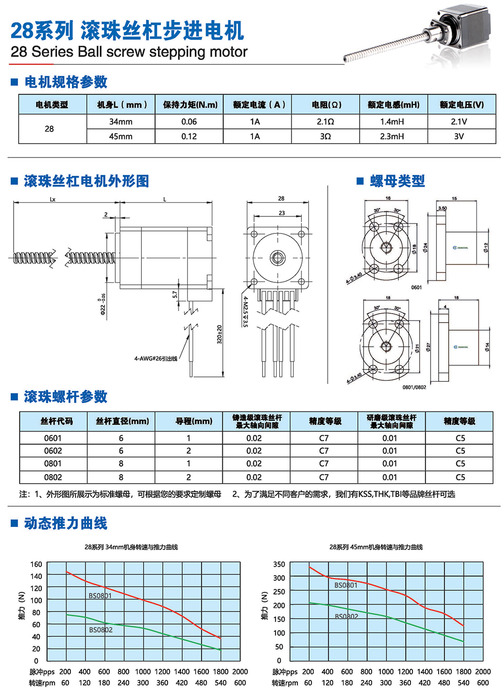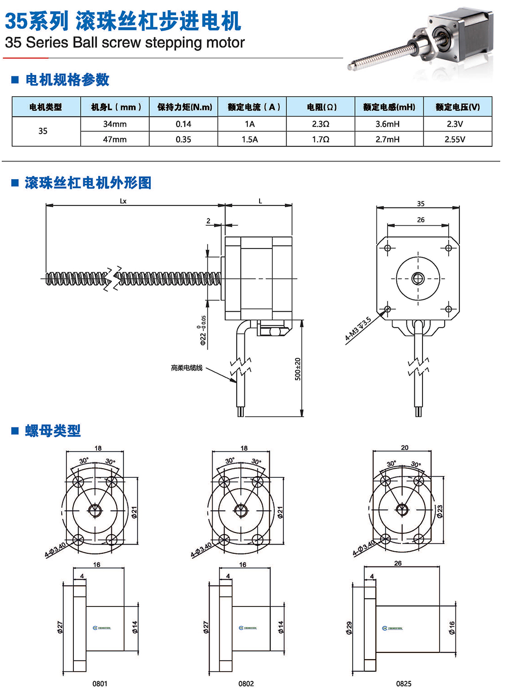 滾珠絲桿步進電機有六種尺寸,外形尺寸從14mm至86mm,滾珠絲桿電機為外部驅動式。 從0.005mm/步到0. 1mm/步,有多種步長可選。推力可達1600N,全系可 選配編碼器。