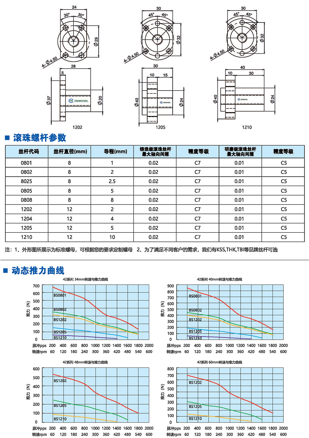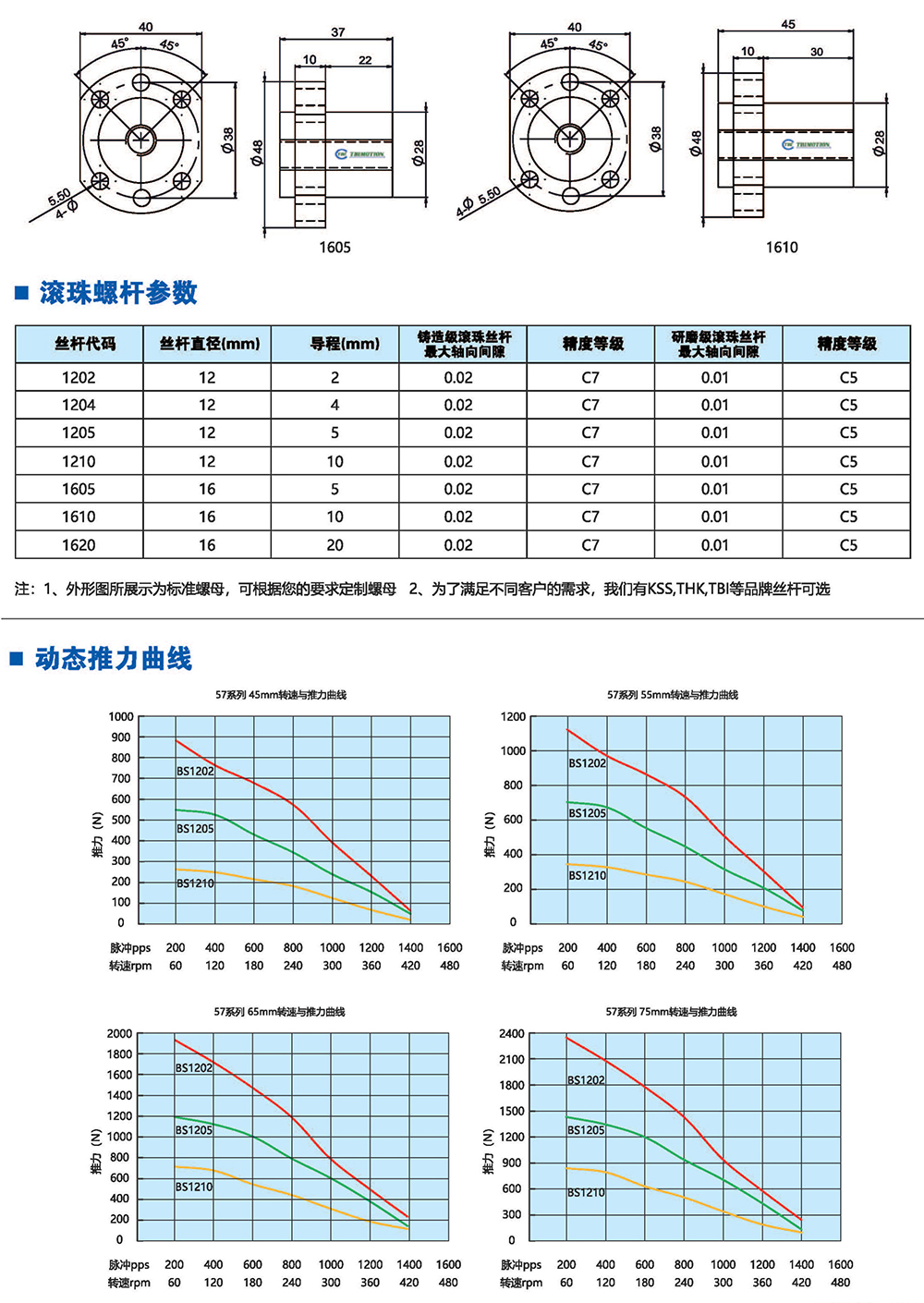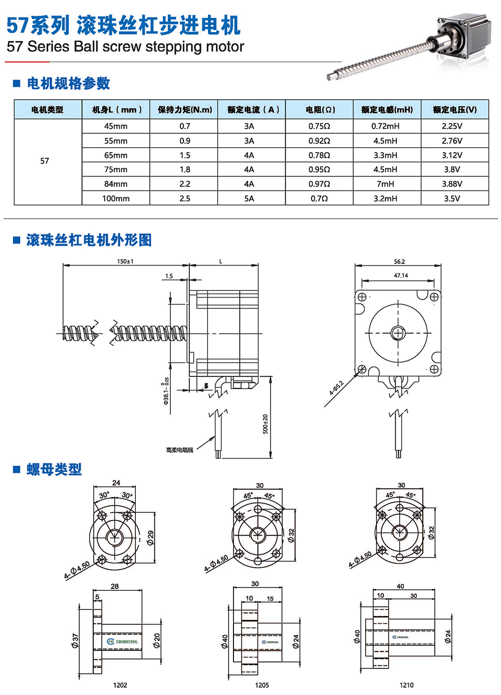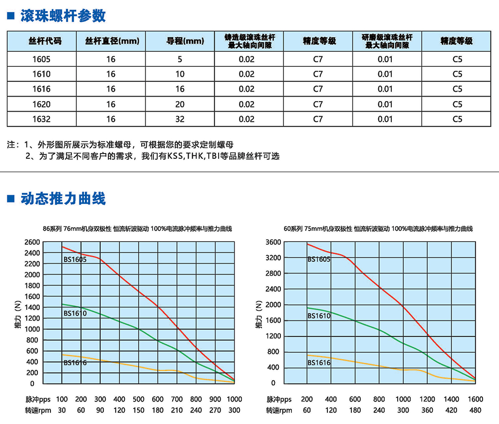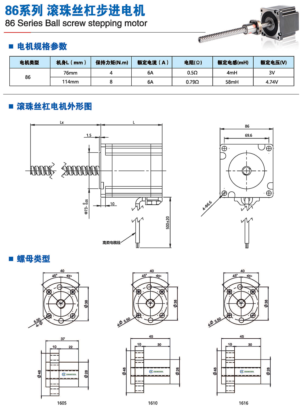 滾珠絲桿步進電機有六種尺寸,外形尺寸從14mm至86mm,滾珠絲桿電機為外部驅動式。 從0.005mm/步到0. 1mm/步,有多種步長可選。推力可達1600N,全系可 選配編碼器。