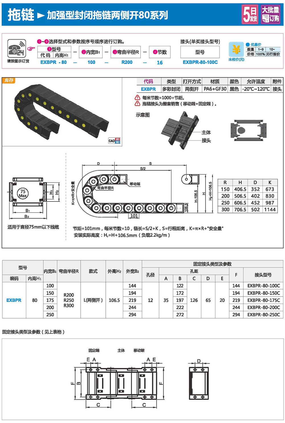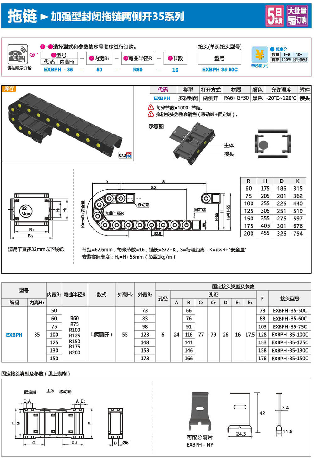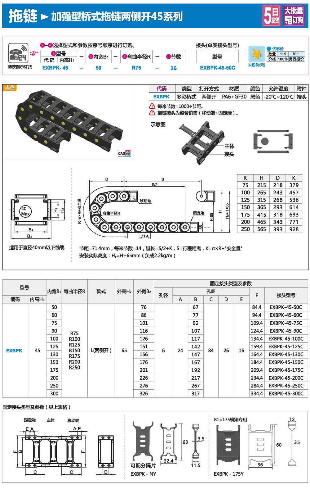 適合于使用在往復運動的場合,能夠對內置的電纜、油管、氣管、水管等起到牽引和保護作用,拖鏈每節(jié)都能打開,便于安裝和維修。運動時噪音低、耐磨、可高速運動。拖鏈已被廣泛應用于數(shù)控機床.電子設備、石材機械、玻璃機械、門窗機械、注塑機、機械手、起重運輸設備、自動化倉庫等。