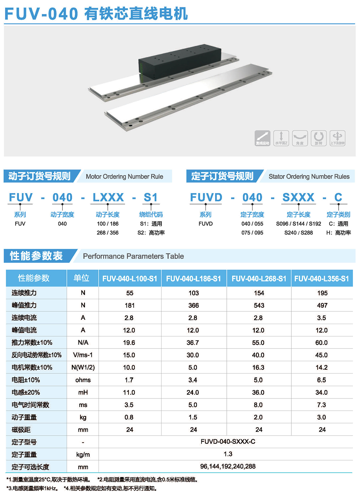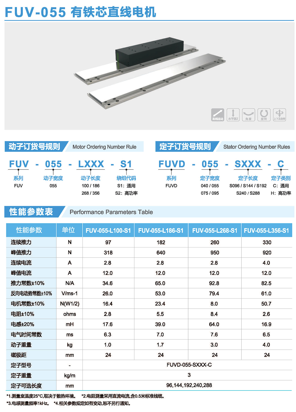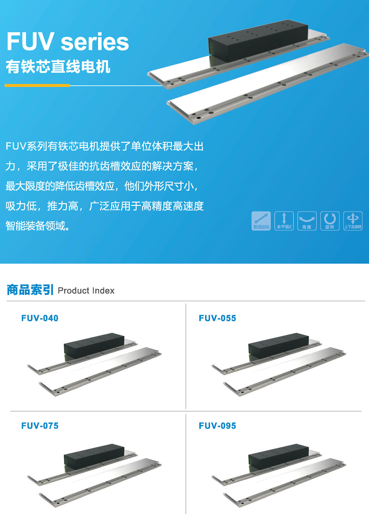 FUV系列有鐵芯電機提供了單位體積最大出力,采用了極佳的抗齒槽效應的解決方案,最大限度的降低齒槽效應,他們外形尺寸小,吸力低,推力高,廣泛應用于高精度高速度智能裝備領域。