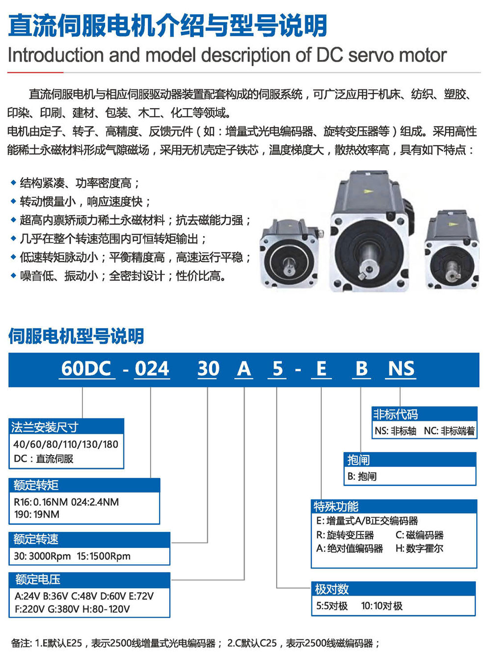 直流伺服電機與相應伺服驅動器裝置配套構成的伺服系統(tǒng),可廣泛應用于機床、紡織、塑膠、印染、印刷、建材、包裝、木工、化工等領域。電機由定子、轉子、高精度、反饋元件(如:增量式光電編碼器、旋轉變壓器等)組成。采用高性能稀土永磁材料形成氣隙磁場,采用無機殼定子鐵芯,溫度梯度大,散熱效率高,具有如下特點: