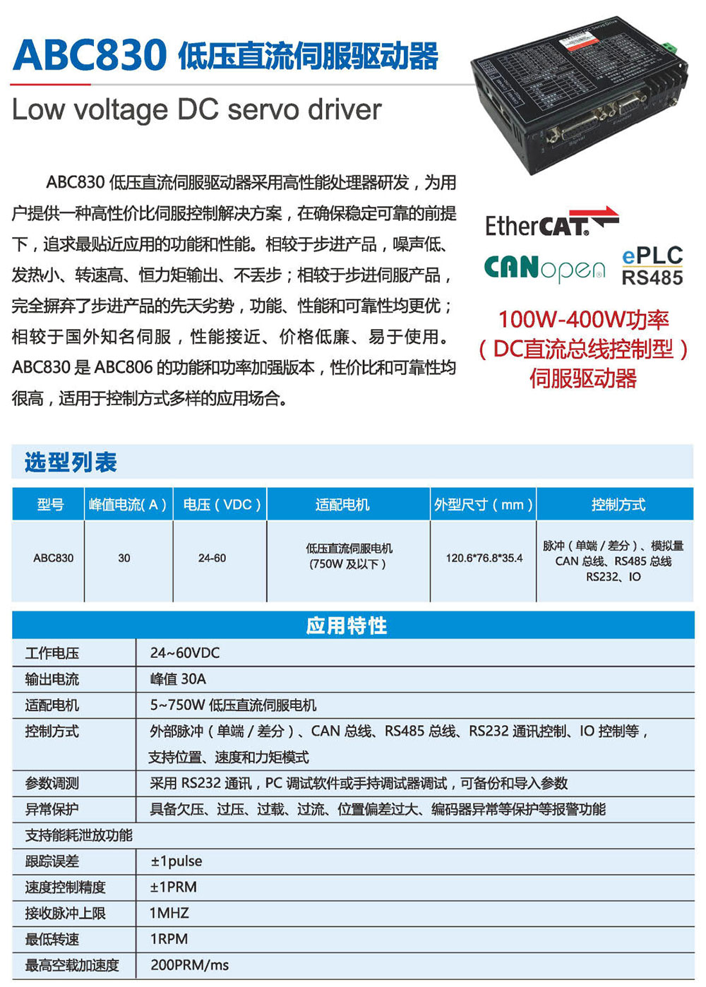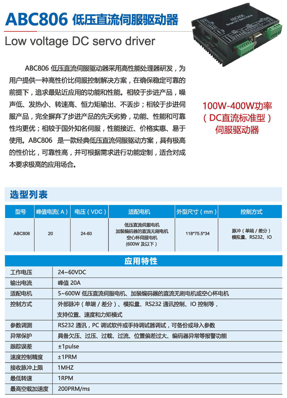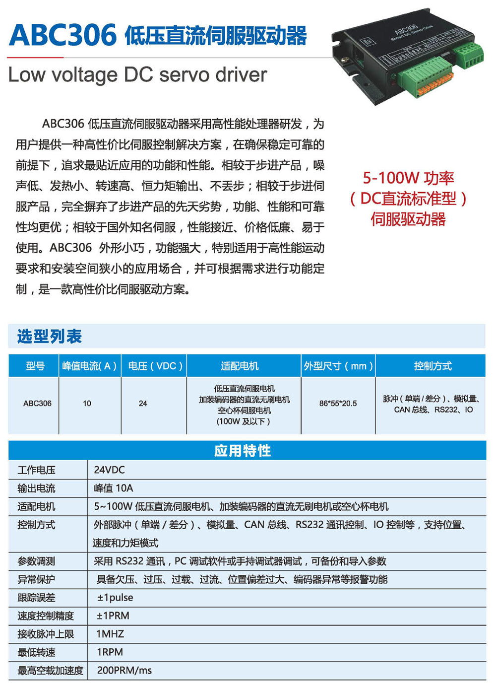 ABC306低壓直流伺服驅(qū)動(dòng)器采用高性能處理器研發(fā),為 用戶提供一種高性價(jià)比伺服控制解決方案,在確保穩(wěn)定可靠的 前提下,追求貼近應(yīng)用的功能和性能。相較于步進(jìn)產(chǎn)品,噪 聲低、發(fā)熱小、轉(zhuǎn)速高、恒力矩輸出、不丟步;相較于步進(jìn)伺 服產(chǎn)品,摒棄了步進(jìn)產(chǎn)品的先天劣勢(shì),功能、性能和可靠 性均更優(yōu);相較于國外知名伺服,性能接近、價(jià)格低廉、易于 使用。ABC306外形小巧,功能強(qiáng)大,特別適用于高性能運(yùn)動(dòng) 要求和安裝空間狹小的應(yīng)用場(chǎng)合,并可根據(jù)需求進(jìn)行功能定 制,是一款高性價(jià)比伺服驅(qū)動(dòng)方案。