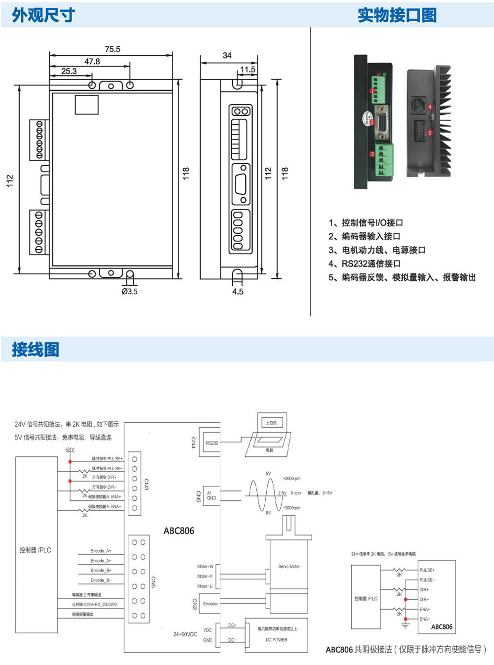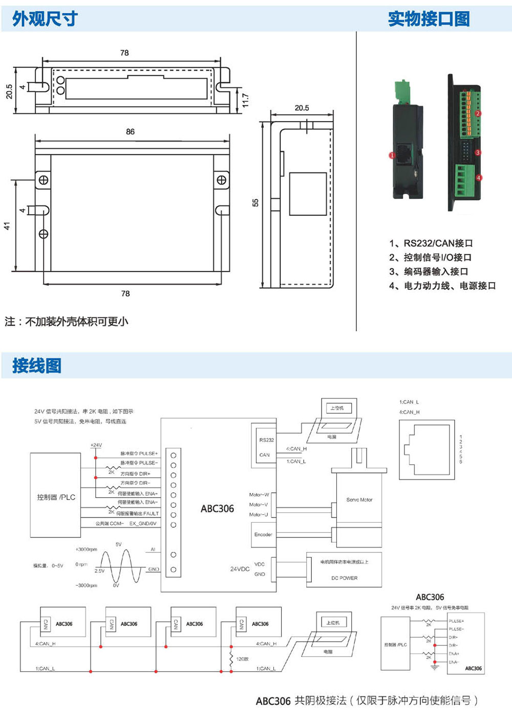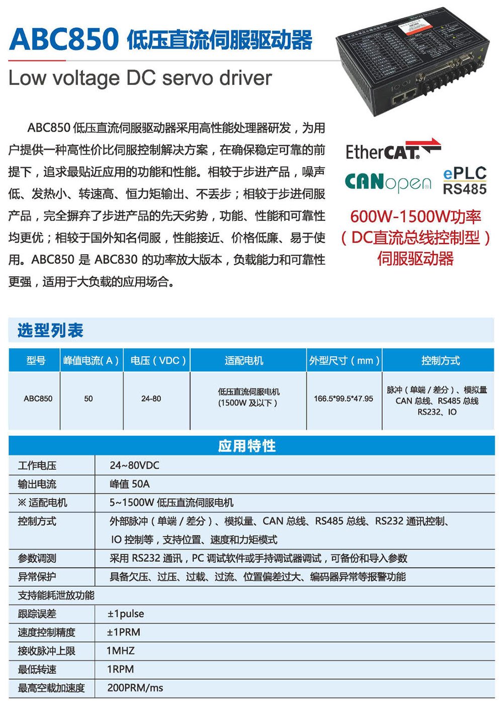 ABC306低壓直流伺服驅(qū)動(dòng)器采用高性能處理器研發(fā),為 用戶提供一種高性價(jià)比伺服控制解決方案,在確保穩(wěn)定可靠的 前提下,追求貼近應(yīng)用的功能和性能。相較于步進(jìn)產(chǎn)品,噪 聲低、發(fā)熱小、轉(zhuǎn)速高、恒力矩輸出、不丟步;相較于步進(jìn)伺 服產(chǎn)品,摒棄了步進(jìn)產(chǎn)品的先天劣勢(shì),功能、性能和可靠 性均更優(yōu);相較于國外知名伺服,性能接近、價(jià)格低廉、易于 使用。ABC306外形小巧,功能強(qiáng)大,特別適用于高性能運(yùn)動(dòng) 要求和安裝空間狹小的應(yīng)用場(chǎng)合,并可根據(jù)需求進(jìn)行功能定 制,是一款高性價(jià)比伺服驅(qū)動(dòng)方案。
